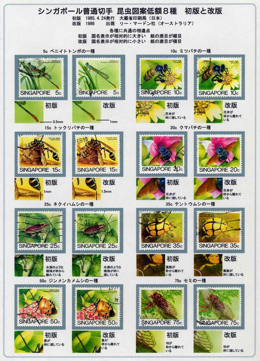 シンガポールで、1985年に昆虫図案の普通切手12種(低額8種、高額4種)が発行されました。当初は日本の大蔵省印刷局で製造されましたが(初版)、低額8種は、のちにオーストラリアのリー・マードン(Leigh-Mardon)社で製造されました(改版)。両者を比較すると、図案のトリミング(原図から印面に使用する部分を切り取ること)がわずかにズレていて、容易に区別がつきます。なお、トリミング以外にも相違点があります。